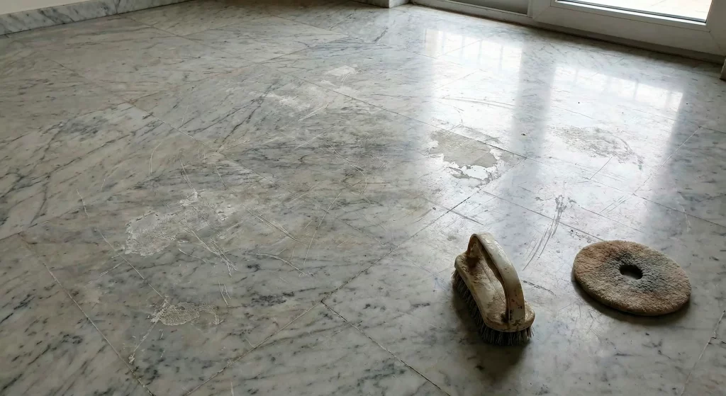 El mármol o terrazo en buen estado se siente suave. Si al pasar la mano notas aspereza, micro-pitting o poro abierto, suele indicar desgaste (o cristalización antigua mal mantenida).